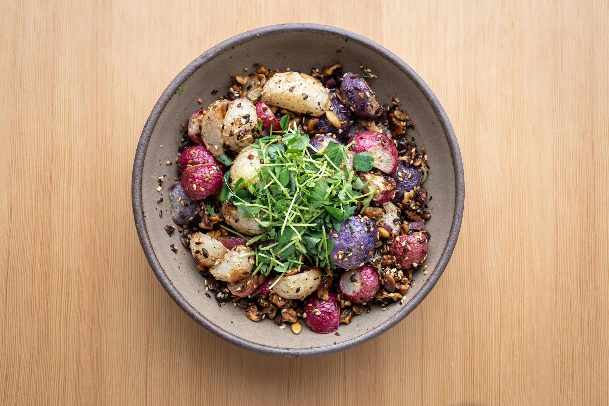 Radishes are made into a dynamic side when they’re roasted and tossed with a toasty, olive-y seedy crunch.
